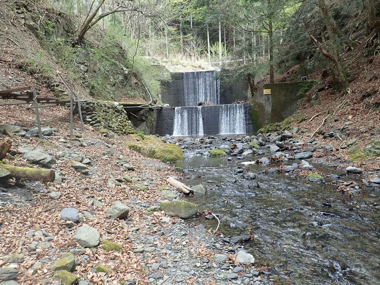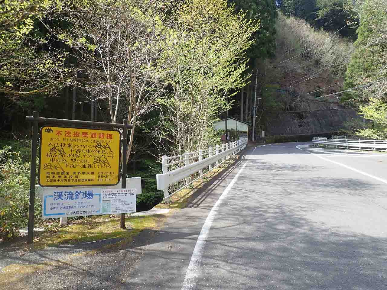 奥多摩湖から峰谷川の上流に向かう場合は、黄色い「不法投棄通報板」を目印にするとよいかと