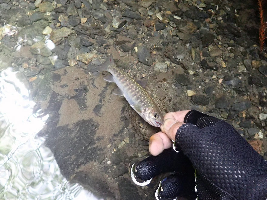 この日は魚影が濃くて、すぐに水中を走る魚の姿が目に入りました。大きさ的にはアブラハヤなどの小魚ではなく、ヤマメなどの渓流魚。