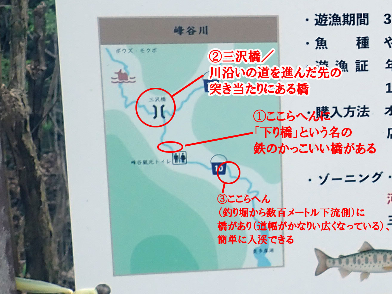 管轄漁協は小河内漁協で、漁協が公開しているマップの峰谷川の釣りができる範囲は3キロメートルぐらい。